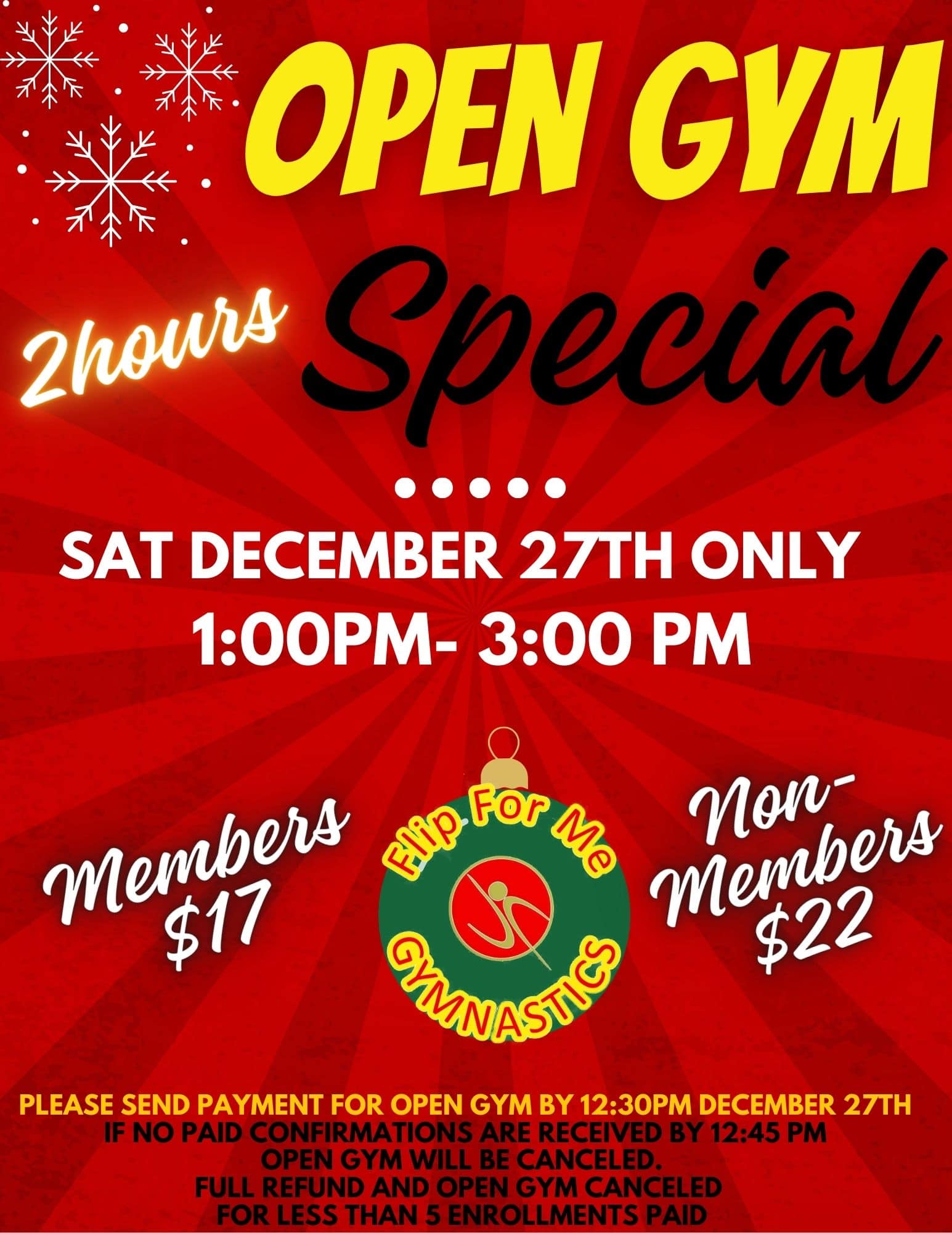 FLIP FOR ME GYMNASTICS IS BRINGING BACK. . . OPEN GYM Special! SATURDAY December 27th…
