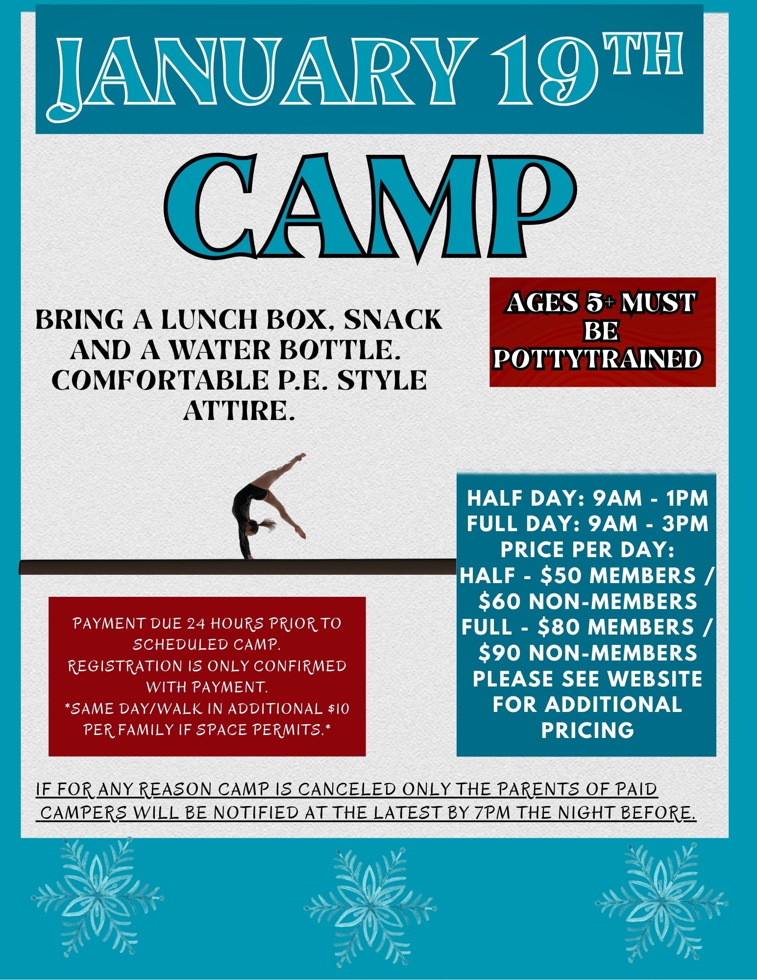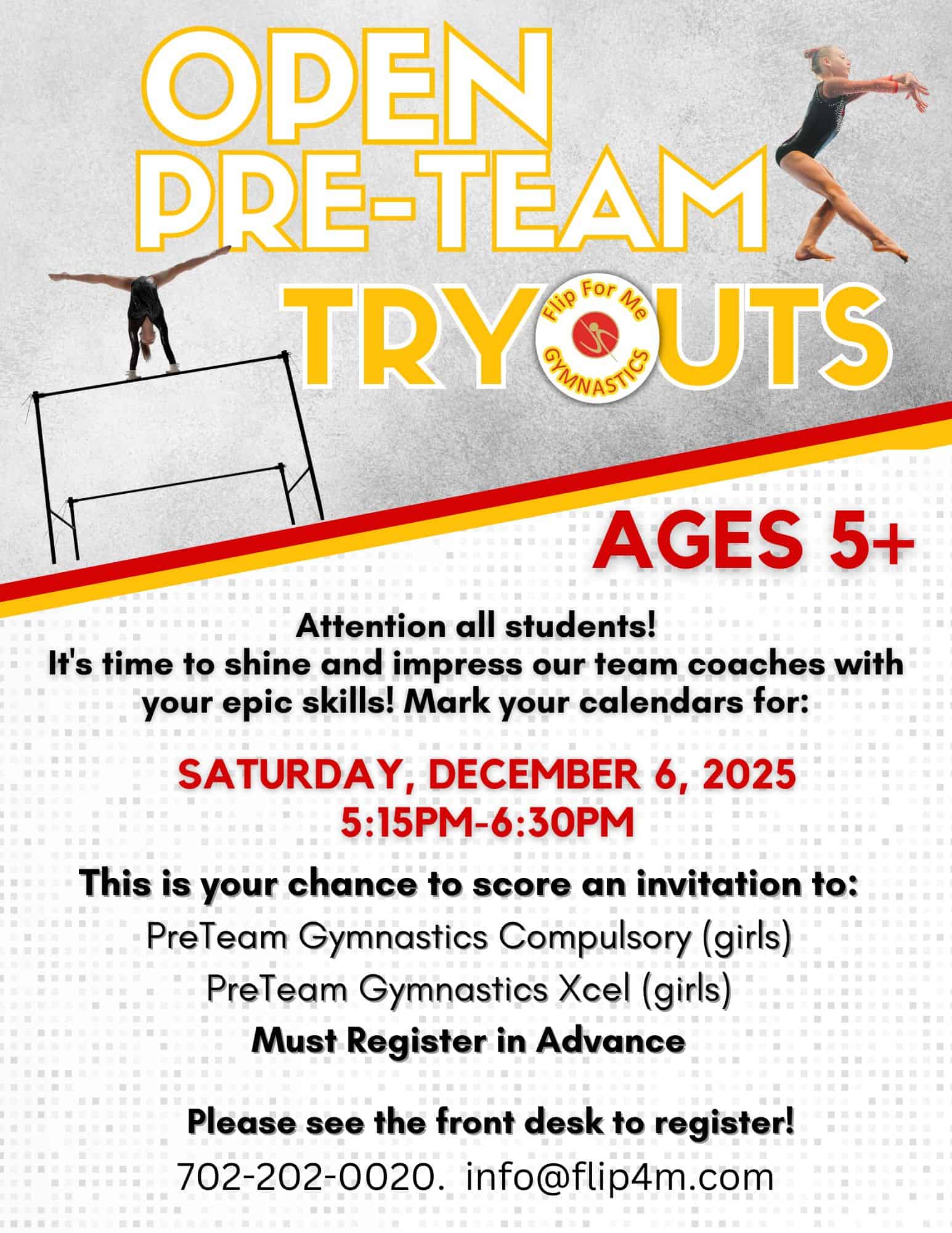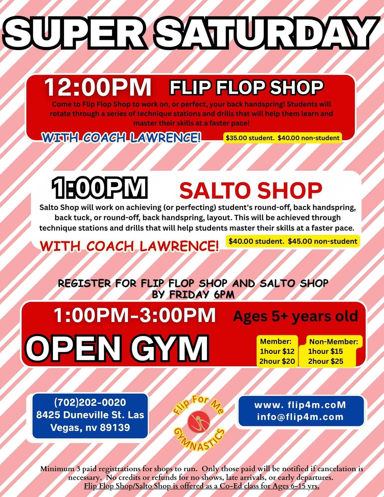Flip For Me Gymnastics holds many events in addition to our classes. Below is a list of our upcoming events.