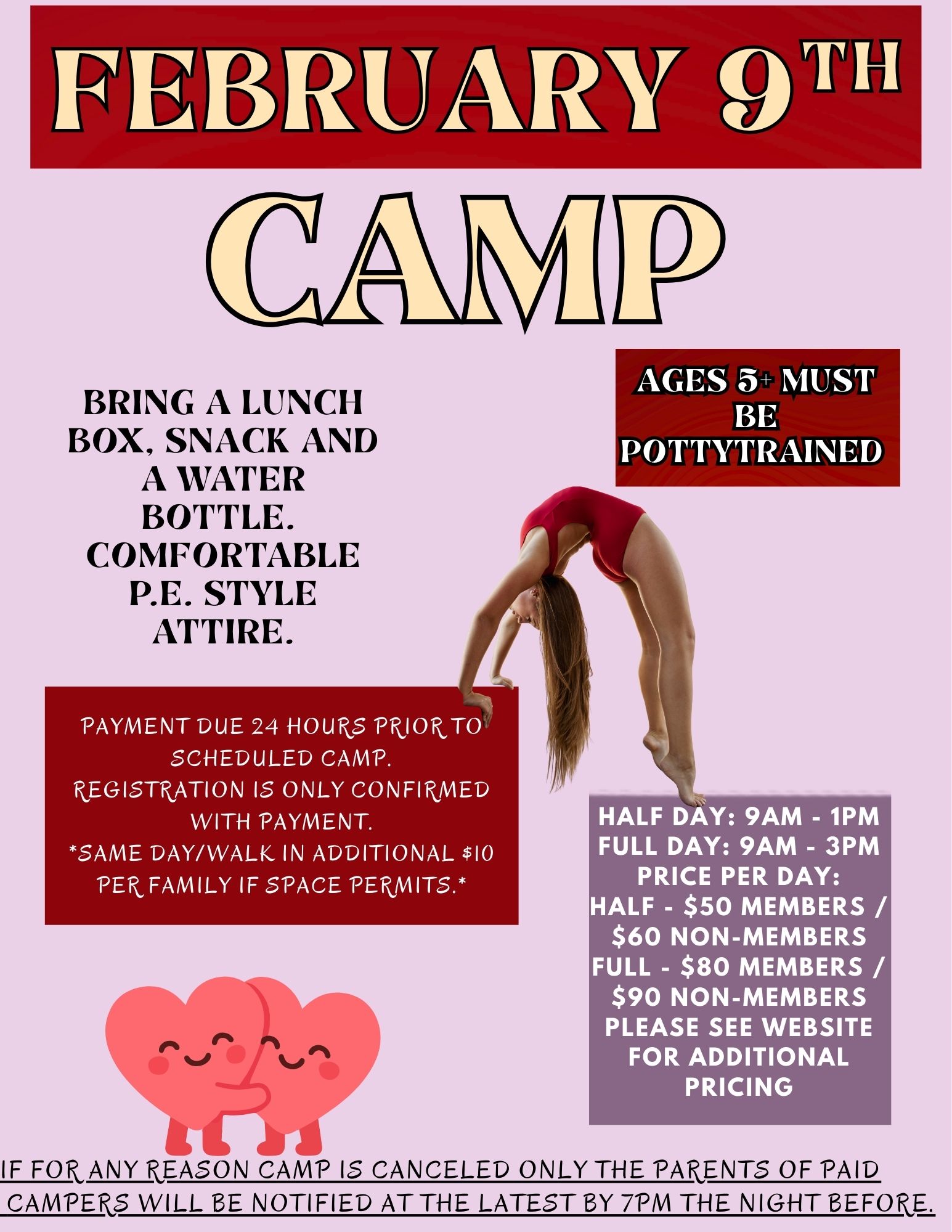 If Flip For Me Gymnastics decides to cancel the event, the front desk will call and notify ONLY those who paid for it. A full refund (less any card fees paid) will be available.